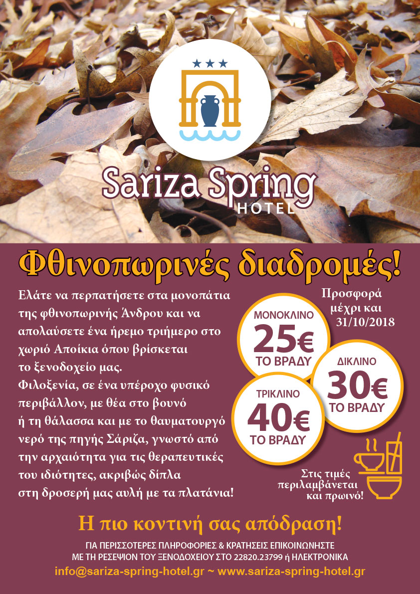 Ελάτε να περπατήσετε στα μονοπάτια της φθινοπωρινής Άνδρου και να απολαύσετε ένα ήρεμο τριήμερο στο χωριό Αποίκια όπου βρίσκεται το ξενοδοχείο μας.